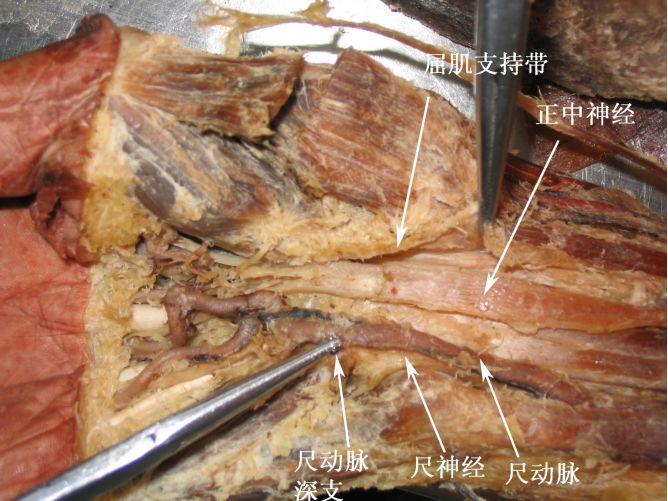 屈肌支持带与腕骨沟共同围成腕管。管内有指浅、深屈腱肌腱和拇长屈肌9条肌腱穿过;分别被屈肌总腱鞘和拇长屈肌腱鞘包绕。二者之间有正中神经通过入手掌。因此当腕骨骨折时可压迫正中神经,引起腕管综合征。