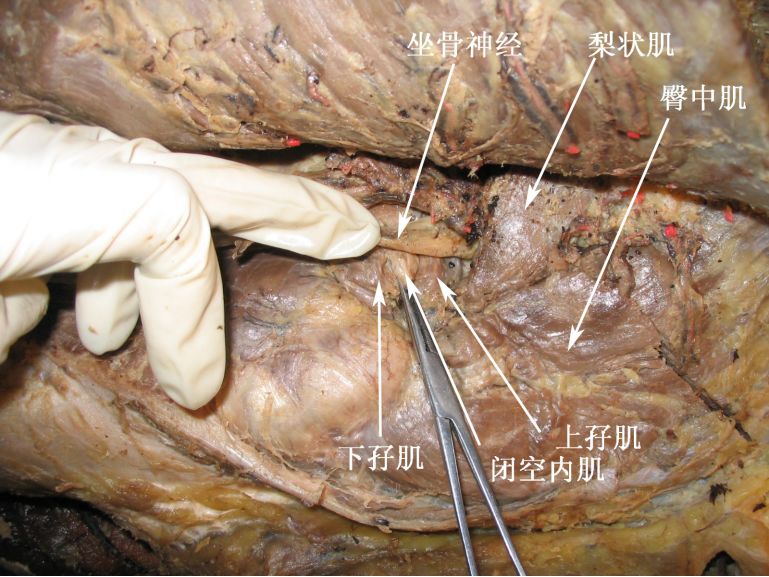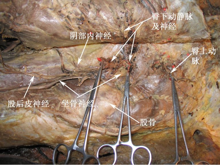 坐骨神经发自骶丛,经梨状肌下孔至臀区,在臀大肌深面,经坐骨结节与股骨大转子之间至股后区,在股二头肌长头深方、大收肌的后面下降,分支支配大腿肌后群和大收肌的内侧部分。其在股中部分为胫神经和腓总神经两终支。