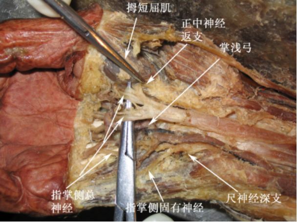 手掌的神经:正中神经在手掌分出6支:自桡侧向尺侧依次为a.1支返支,b.3支指掌侧固有神经,c.2支指掌侧总神经。尺神经在手掌分为深、浅两终支。浅支分出1支指掌侧固有神经,1支指掌侧总神经。深支主要为肌支,伴行尺动脉掌深支。