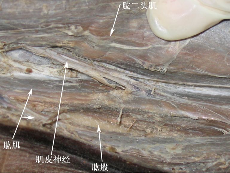 肌皮神经:起自臂丛外侧束,穿喙肱肌,经肱二头肌与肱肌之间,行向外下方,发肌支支配上述三肌;其末支从肱二头肌与肱肌之间穿出,在肱二头肌外侧沟下份浅出深筋膜,称为前臂外侧皮神经。