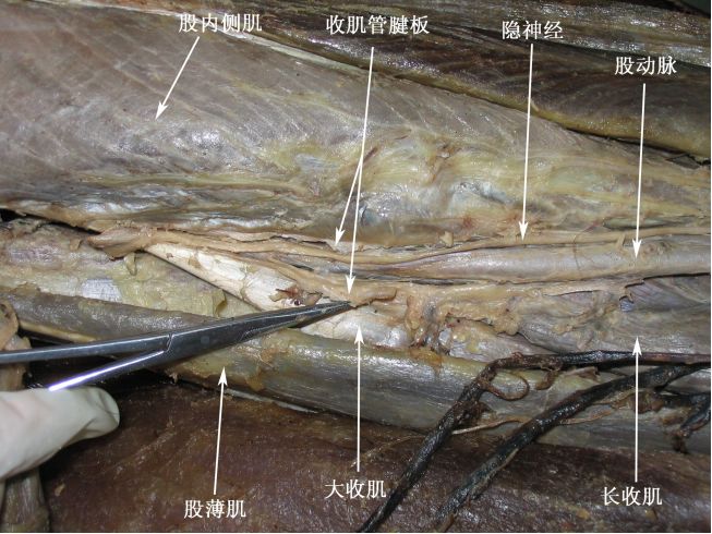 收肌管位于大腿中部。缝匠肌深面,大收肌与股内侧肌之间。管前壁为一腱板,上口通股三角尖,下口为收肌腱裂孔。管内由股血管、隐神经和至股内侧肌的神经通过。