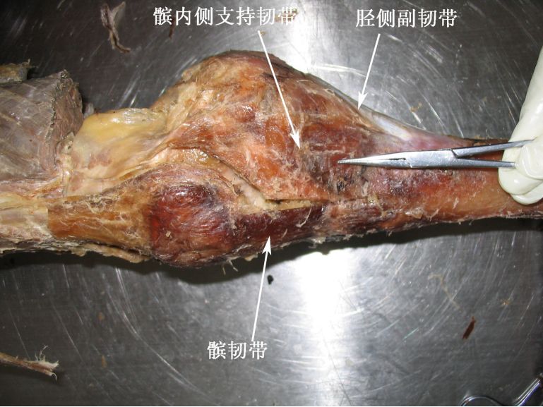 内侧部:胫侧副韧带及其后外侧的缝匠肌和股薄肌。