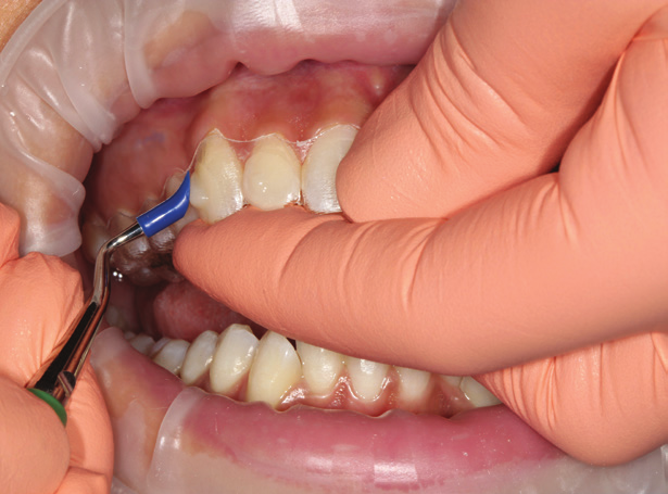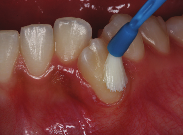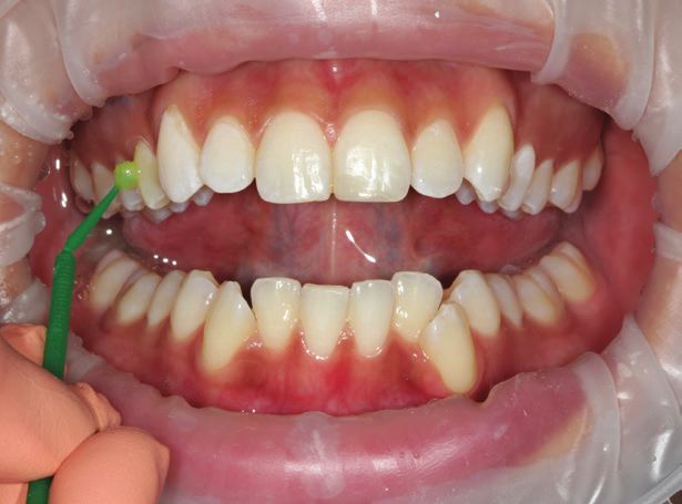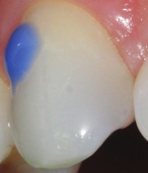磷酸酸蚀附件定位的牙面,冲洗吹干后可见牙面呈现白垩色
