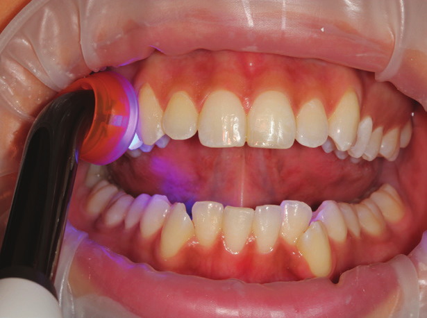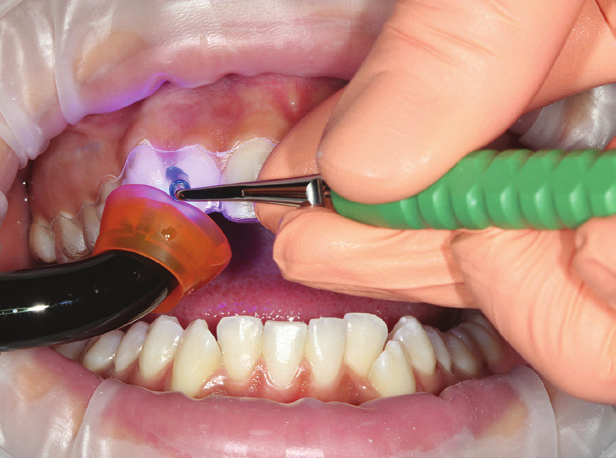 按压模板使树脂与牙面密贴的同时进行充分的光照固化