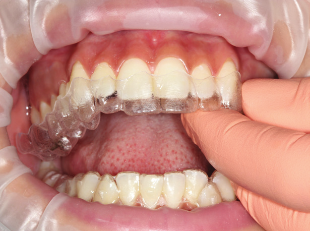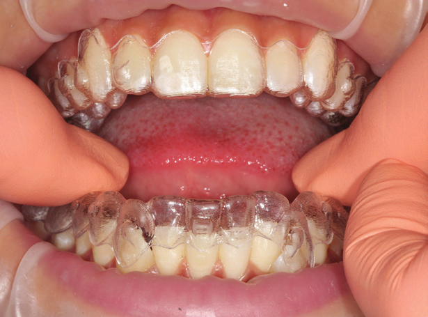 戴用 1~ 2 周患者适应后用它制作附件。在制作附件前, 临床医生应该在模板的附件部位打上小孔, 其作用是挤出多余的光固化树脂, 以免多余树脂粘贴到牙面上妨碍后续隐形矫治器的就位 。