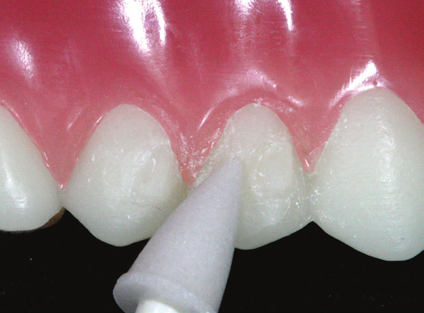 用矽粒子(10,000 rpm - 12,000 rpm)将附件周围溢出的树脂材料轻轻磨除;动作要仔细,避免碰触附件破坏其形态