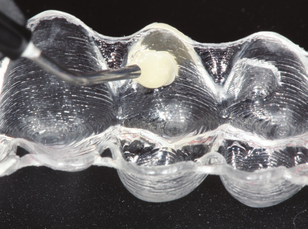 将Beautifi l Flow Plus F00注入附件模板的空腔内,确保树脂内无气泡,树脂超充呈微微隆起状效果更佳