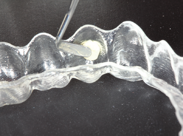 注意:制作附件的牙位是由附件定位模板决定的。在附件定位模板相应牙位上已经预成了用于制作附件的阴模, 光固化树脂放入其中, 树脂固化后粘贴到牙面上形成附件。