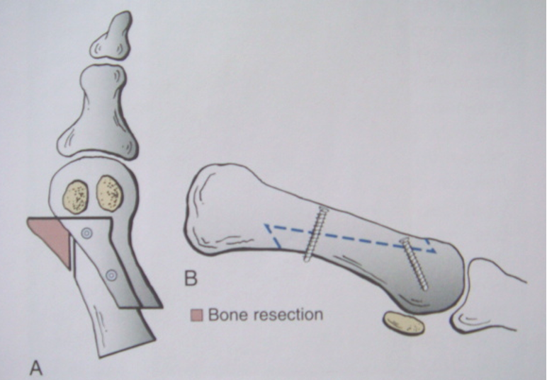 主要适应于伴有骨性关节炎、拇僵直等患者切除近节趾骨基底1/3长度常能解除疼痛与畸形,但术后拇趾连枷,有时推进无力。