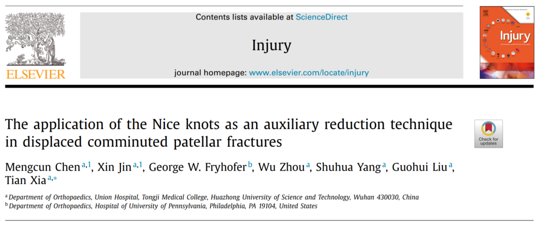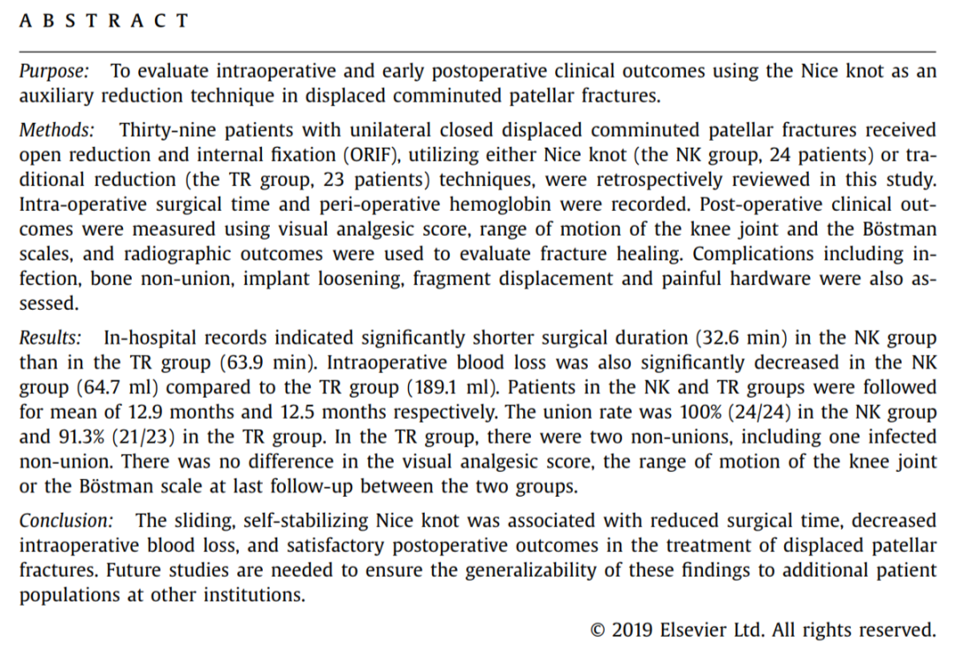 通常,复位髌骨骨折需切开骨膜,进行拼接,但容易导致骨块旋转、游离,增加拼接难度。关于缝线辅助复位固定的方法已经在肱骨近端骨折维持骨块复位中应用广泛,因此,有学者将Nice结应用于髌骨粉碎骨块的复位与维持,取得了良好效果,研究结果发表在Injury上。
