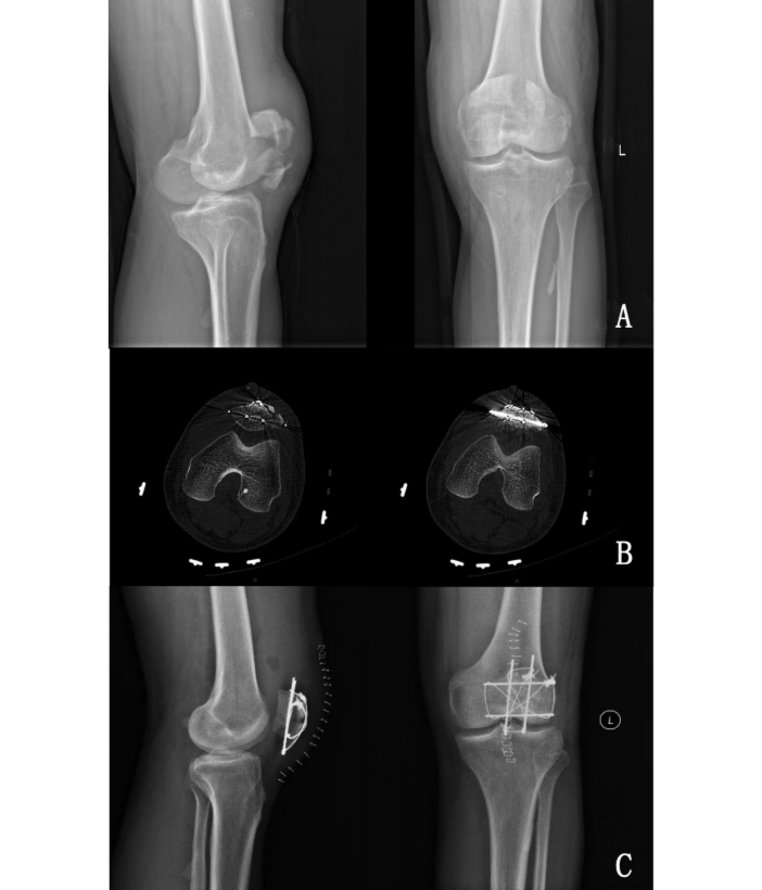 [方法:回顾性地评价39例单侧闭合移位性粉碎髌骨骨折患者采用尼斯结(NK组,24例)或传统复位术(TR组,23例患者)进行开放复位和内固定(ORIF)。记录术中手术时间和围手术期血红蛋白。使用视觉镇痛评分、膝关节活动度和Böstman量表测量术后临床结局,并使用影像学结局评估骨折愈合情况。还评估了并发症,包括感染,骨不愈合,植入物松动,碎片移位和疼痛的硬件。]