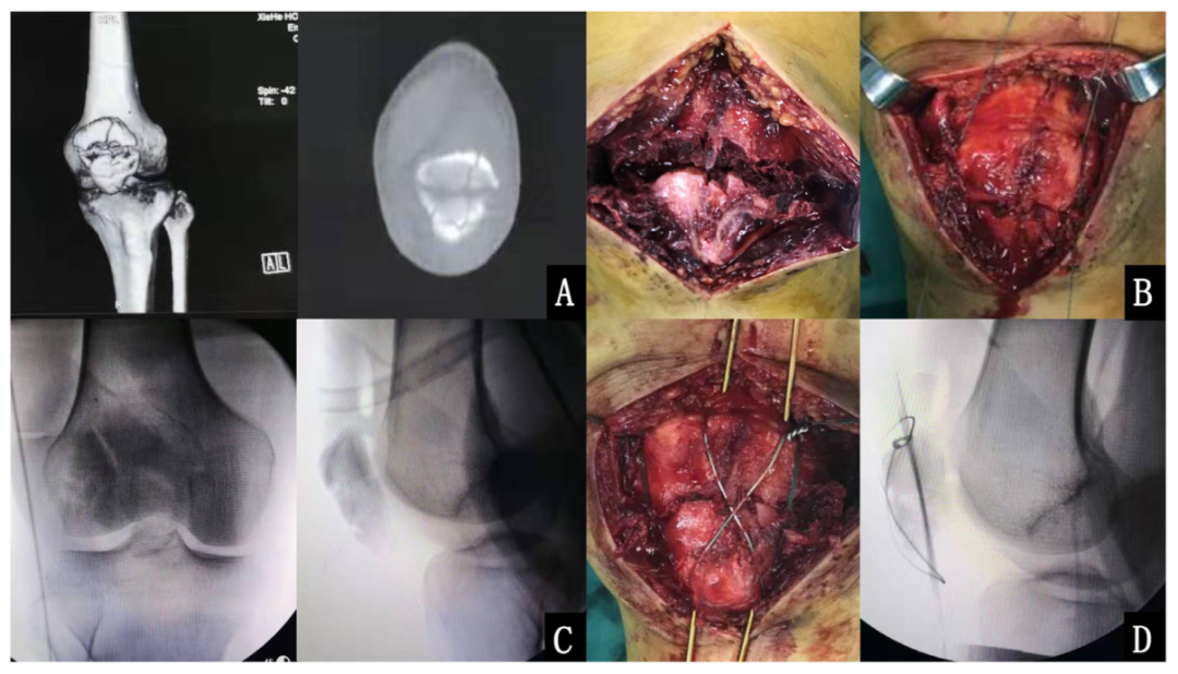 图2:尼斯结术中手术图。A.髌骨粉碎骨折;B.尼斯复位后;C.透视见复位良好;D.克氏针带张力固定。