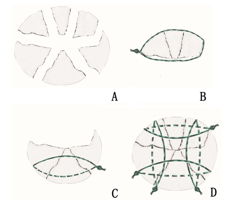 附:常规髌骨骨折复位需切开骨折表面骨膜,将骨折线完全暴露,但缺乏骨膜附着的骨块很容易游离,导致无法辨认原有位置。在使用Nice时,只需暴露主要骨折块,然后在髌骨两侧韧带中开口,将所有骨块包裹在一个"口袋"中,然后从两侧开口中置入缝线打结。下图为Nice结示意图。