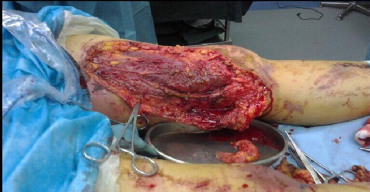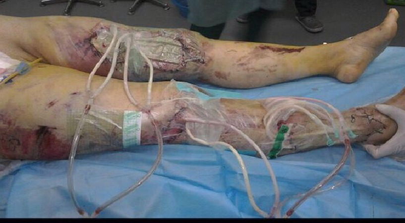 男性患者,40岁。车祸致双下肢流血伴皮肤缺损2小时入院。