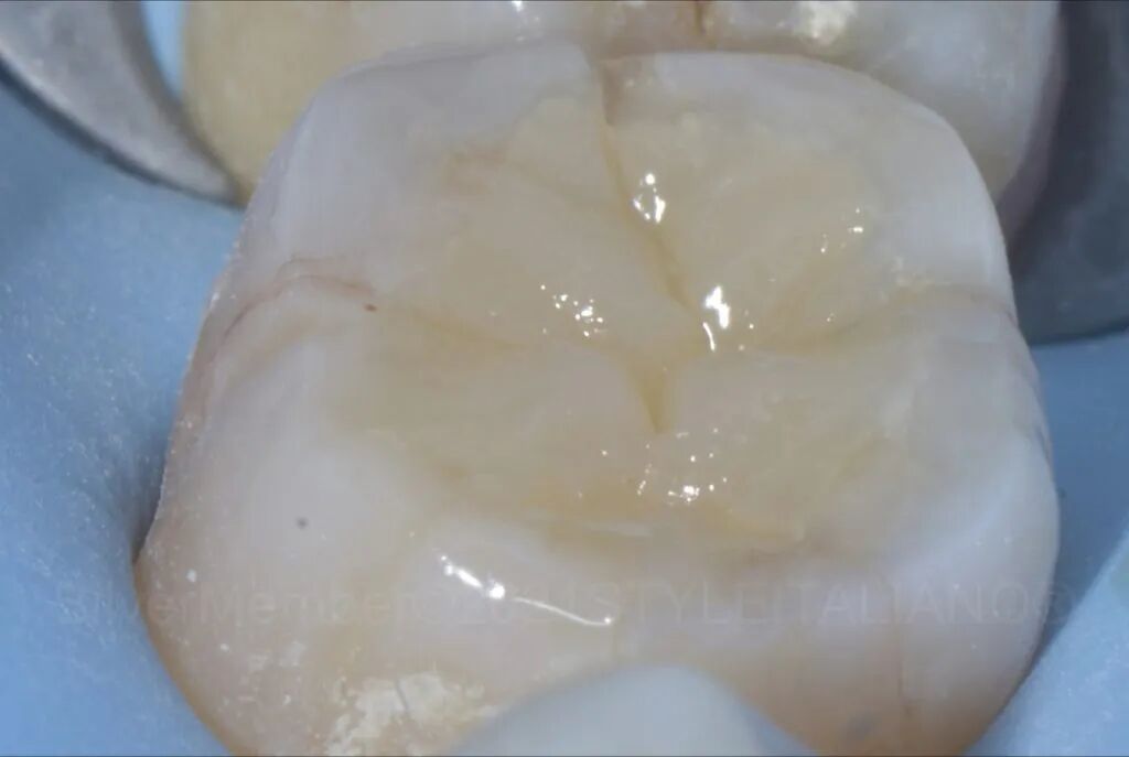 可以看到患牙四周的牙体组织壁较薄弱,且远中边缘嵴存在隐裂纹。考虑到患牙不得不做根管治疗,我们可以想象的到当时的龋洞应该相当大,甚至可能破坏了牙尖,导致四周壁薄弱。