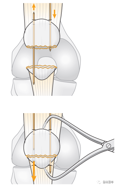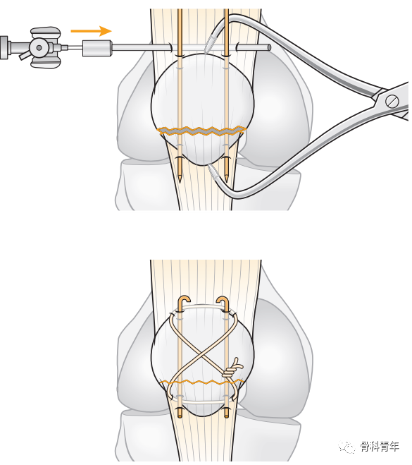 张力带固定是髌骨骨折最主流的固定方法,通过将前方的张力转变为骨折块间压力。具体步骤如下图所示: