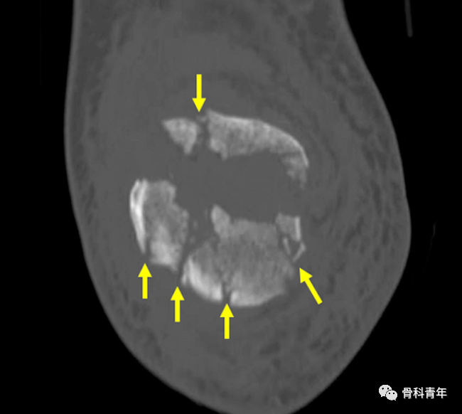 关于髌骨横行骨折,尽管在X线上较多髌骨均可见横行骨折线,但CT检查可发现仅有16%的髌骨骨折为单纯的横行骨折。这提醒我们在复位过程中,不应只关注于横行骨折线的复位,周围的骨折线也应注意到,并精确复位。