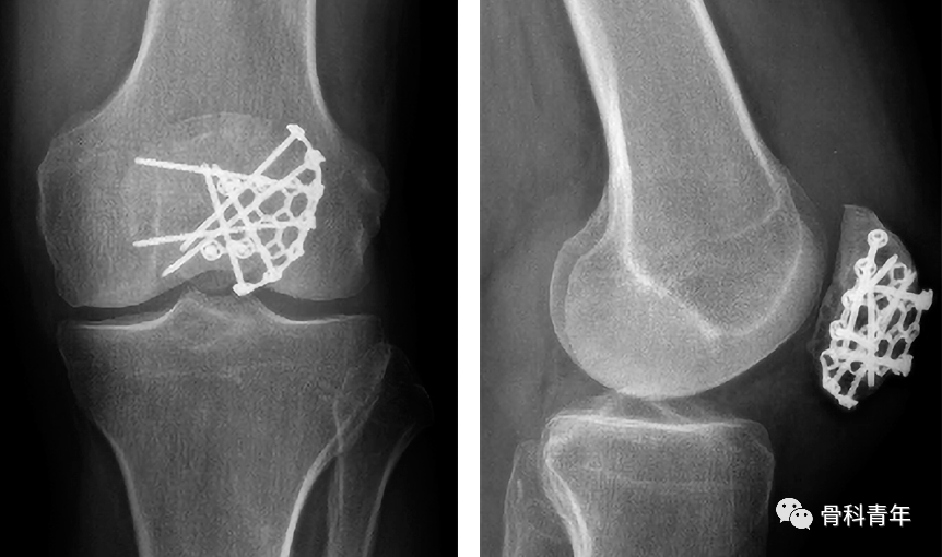 Lorich等描述了9名患者,他们通过外侧关节切开术和使用允许多平面螺钉固定的新型笼形钢板进行复位。所有患者在平均23周达到愈合。只有1名患者出现需要移除的有症状植入物。未发现骨坏死、感染或伤口并发症的病例。由同一作者进行的一项前瞻性队列研究比较了25例接受相似多平面笼式固定的患者和33例接受张力带固定的患者。他们注意到,在钢板组中,大腿肌肉萎缩和膝前方疼痛明显减少。