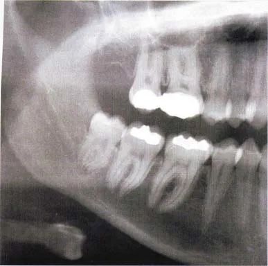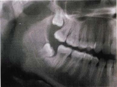 a右上颌第三磨牙阻生,C分类伴轻度近中倾斜。牙囊组织的增厚有利于阻生牙的脱位。第二磨牙的牙槽窝骨壁未发生吸收。由于牙根已基本发育完成,故牙无法继续萌出。通过×线照片无法判断腭根存在与否。注意阻生牙于上颌窦之间的关系。