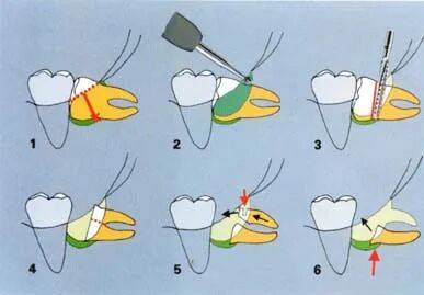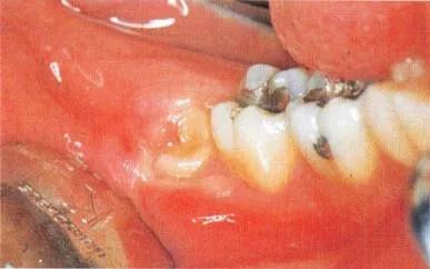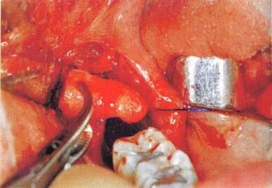术者应根据手术的不同阶段,控制好不同设计的黏骨膜瓣的位置。拉钩的顶端拉向术区上方的骨面。