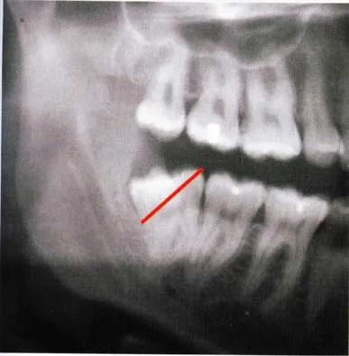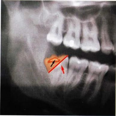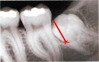 代表牙槽窝深度的红线表明从牙槽嵴顶到釉牙骨质界间在近中颊角方向上的距离。考虑到患者的年龄,阻生牙牙槽窝的近中骨壁较容易以第二磨牙牙根旁的硬骨板为基础分化再生。