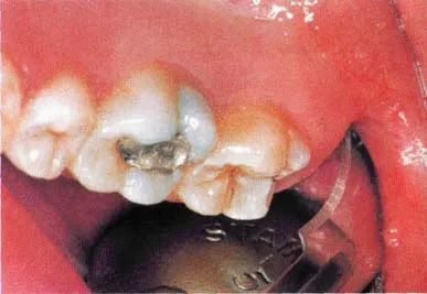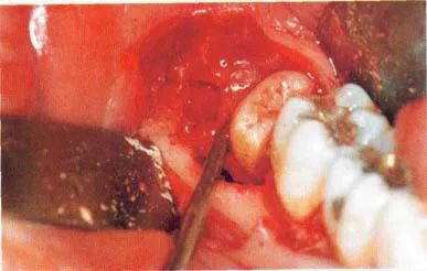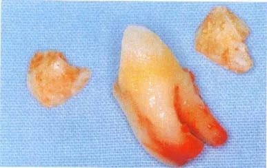 尽管事先已挺松牙根,但仍无法顺利掏出。于是用纺锤形车针扩大牙槽窝,操作时应紧贴牙槽窝内壁。拔出牙根后可见根尖肥大。这通常与牙骨质增生有关,故不能通过牙挺施以暴力而拔除。术者应尽量避免折裂牙槽窝骨壁。