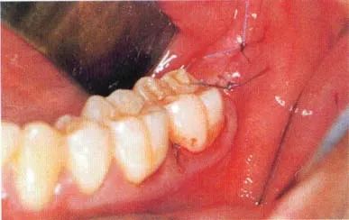先用2针缝合垂直切口,然后单独缝合1针将龈乳头固定回楔状隙。瓣的远中部分用纱布压迫止血后间断缝合2针(用不可吸收的缝线合18mm的缝针较为可取)。术后8 d拆线。