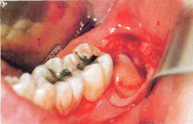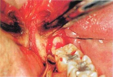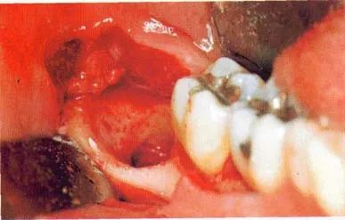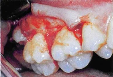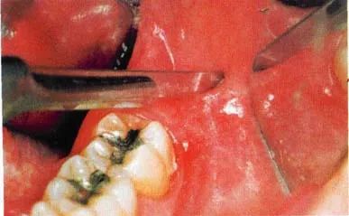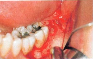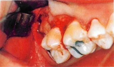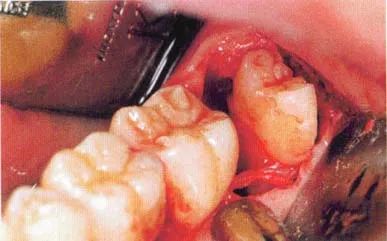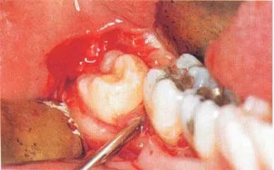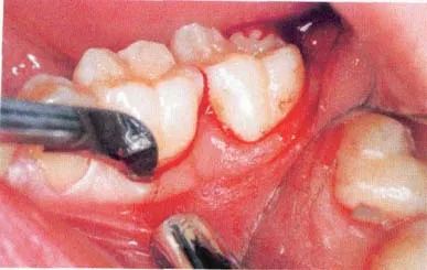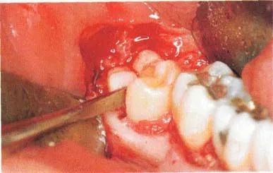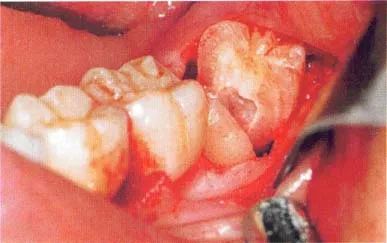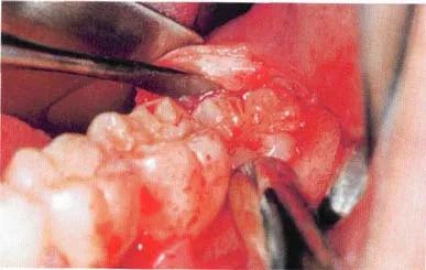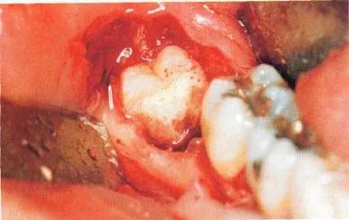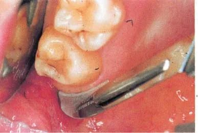 c翻起磨牙间的龈乳头后,再用钝的牙挺从前往后得翻起龈边缘,在翻起黏骨膜瓣时要格外小心(注意不要使其撕裂)。骨壁由于牙囊组织增厚的缘故而变薄。显露牙冠的过程较为顺利