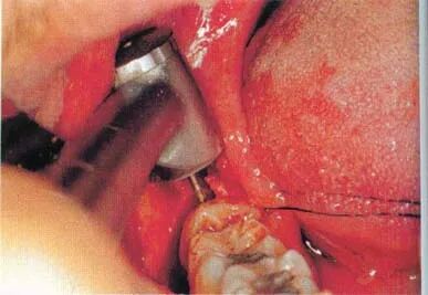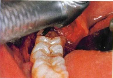 2.用装在机头上的圆钻去除远中骨质以显露阻生牙颌面;