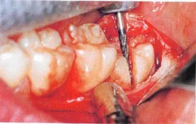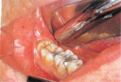 若埋伏程度较深,则需要剥离较大面积的骨膜。在沟内切口的末端再做垂直切口有利于骨膜的剥离和黏骨膜瓣的翻起,同时也可避免龈组织的撕裂。做垂直切口时可用15号刀片从前庭沟切向磨牙与前磨牙之间的楔状隙。