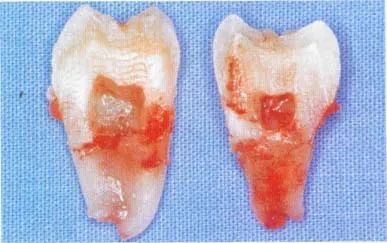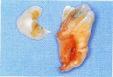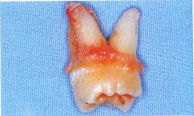 该病例也可不切割牙冠而拔除,拔牙时去除了牙根间隔。