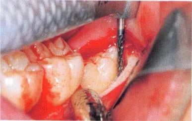 使用血管钳币和 Lucas刮匙将牙囊碎片清除干净。用人直径的圆钻修整牙槽骨的游离缘。