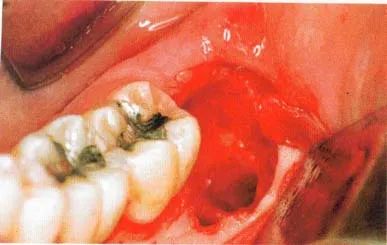 g 检查牙槽窝,用Lucas双头刮匙及小的骨钳去除牙囊组织碎片。缝合黏骨膜瓣前用生理盐水冲洗拔牙窝