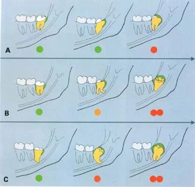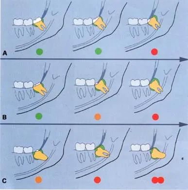 阻生深度可通过与第二磨牙的关系(A、B、C分类)估计,同时也表明去骨量。因此,手术的原则主要取决于阻生深度。如果无须去骨或只需少量去骨,那么也可以直接拔除第三磨牙,但还需同时满足以下条件: