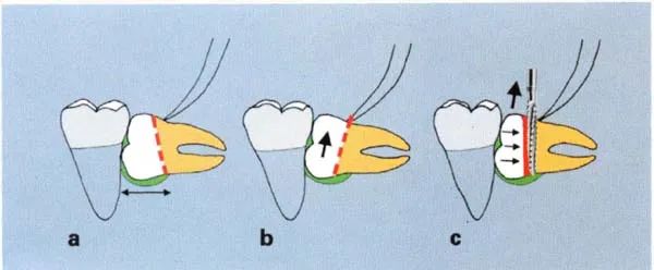 可在拔牙的过程中再做垂直切口:显露阻生牙时需去骨以增加牙的松动度,当去骨的范围较术前计划的要大的情况下再做垂直切口。