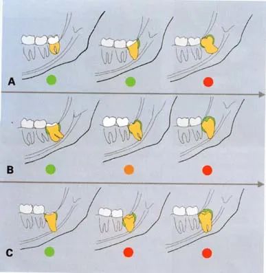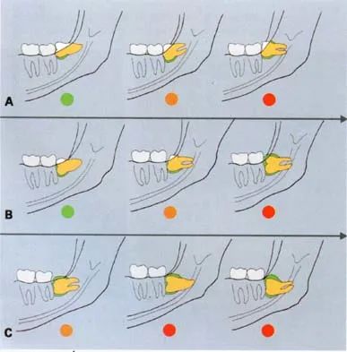 A、B及C分类表示阻生牙的位置与第二磨牙的牙冠、牙颈部及牙根的关系。手术的难度随阻生深度的增加而增加。第Ⅰ、Ⅱ及第Ⅲ类阻生牙与第二磨牙和下颌升支之间的距离相对应。