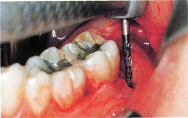 若手术入路和视野受到限制,使用圆钻会比纺锤形的车针安全,尽管后者的切割深度较大。术区难于直视,但术者可通过切割骨密质和骨松质的不同手感来判断是否已经切割到牙体组织。