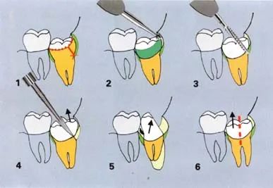 4.用合适的牙挺能顺利地挺裂牙冠井挺出牙片;