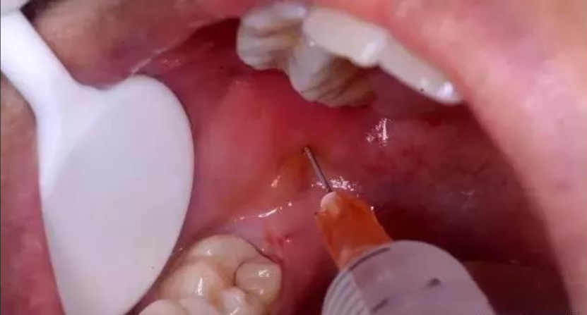 注射针污染,注射部位、麻药消毒不严格,注射针穿过炎性病灶,均可将细菌带入深部组织,引起颞下间隙、翼下颌间隙、咽旁间隙感染。深部感染临床症状多出现在注射后1~5天,表现为局部红、肿、热、痛明显,炎症若不能得到有效控制,可以出现张口受限或吞咽困难,偶尔可引发全身症状。