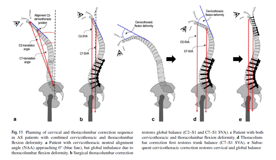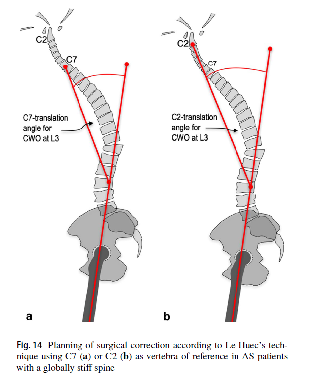 强直性脊柱炎(ankylosing spondylitis, AS)截骨矫形主要包括三方面:截骨节段、截骨角度设计和截骨方式。其中,截骨角度设计是理论的难点,主要有以下一些设计方式。1. 根据C7-SVA和C2-SVA的设计