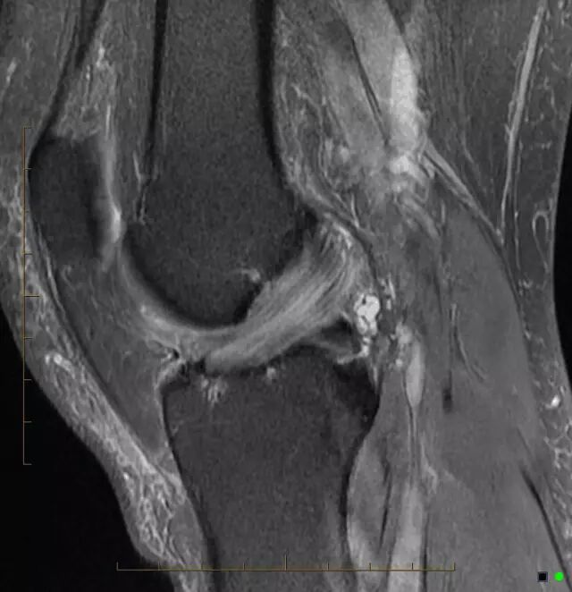 正常前交叉韧带(ACL)是由胶原纤维组成的,并在磁共振成像表现为低信号带。芹菜杆征(celery stalk sign)为ACL黏液样变性的特征性表现。关节镜下所见黏液样变性为淡黄色硬化物质,当ACL黏液样变性时,无定形的黏液细胞增加ACL的信号强度,并局部地分布于完整的、平行走行的ACL纤维束,形成了芹菜杆样外观。