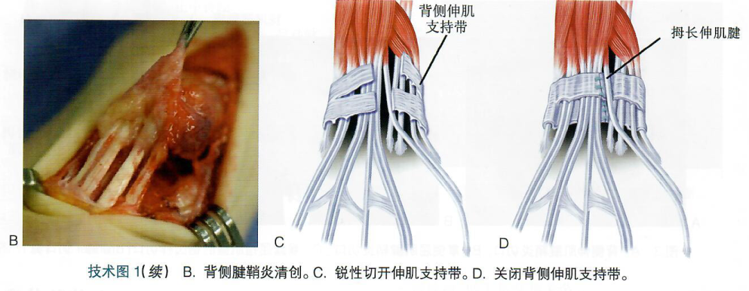 ●用咬骨钳或锐性剥离的方法去除每个腱鞘内肥厚的滑膜(技术图1B)。