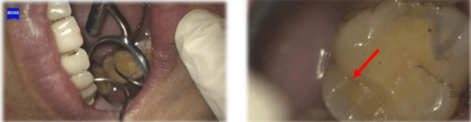 2、若患牙曾进行牙体牙髓或修复治疗,一方面由于去除了部分牙体组织使得牙齿的刚性降低,另一方面修复体的放置可能使残余牙齿上产生应力集中,相比正常牙齿更易发生折裂;