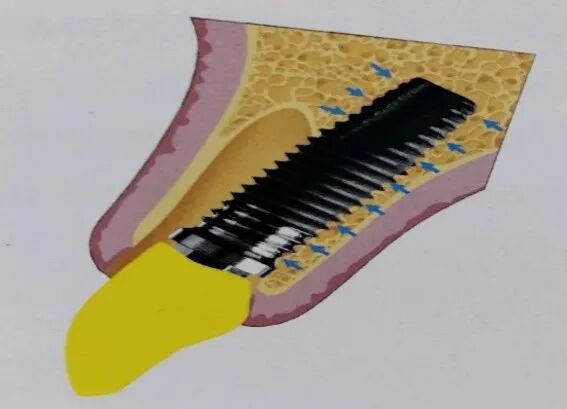 4、植入种植体注意保持种植体向上,避免松动脱落, 采用慢速手机植入或手动植入,植入过程中应辅以外力保证种植体按照预想角度植入,避免过大扭矩。