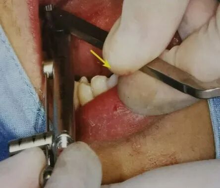 若以右前方观察会误以为钻针的位置定位偏近中,而图中蓝色箭头所示位点会误以为是正中位点, 若采用正颊侧观察,钻针已经是正中位点。为了做到正颊侧观察这一点,需要医师和助手相互合作,助手尽量牵拉口角,充分提供良好的视野,医师的体位就显得尤其重要。