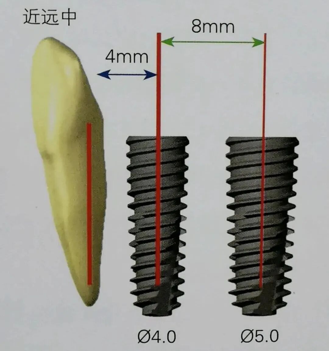 4.0的种植体与天然牙的距离计算:1.5+4.0/2(近中种植体的半径)=3.5 ≈4。