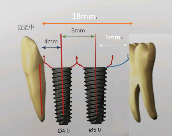 两颗种植体轴心之间的距离计算:4.0/2(近中种植体的半径)+3+5.0/2(远中种植体的半径)=7.5 ≈8。在这种情况下,可以完成近远中径为8mm的两颗前磨牙种植修复。