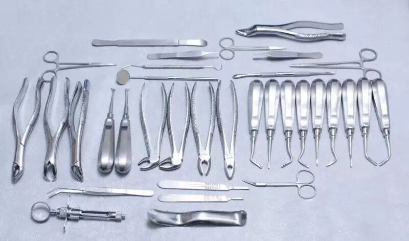(2)牙钳(上牙钳、下牙钳),牙挺,牙龈分离器,刮匙,持针器,缝针,缝线。