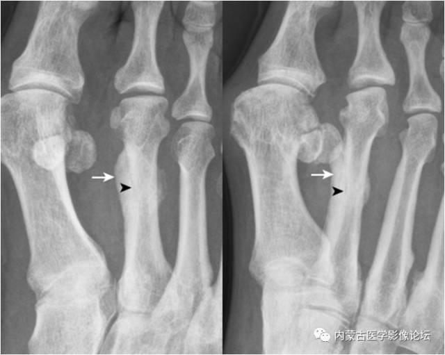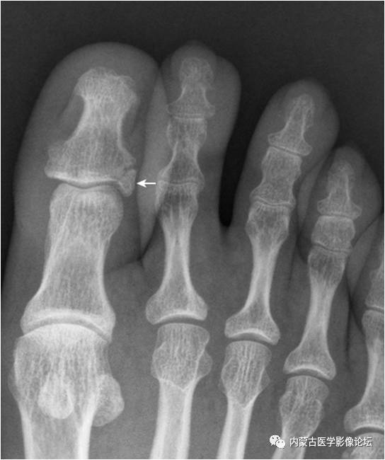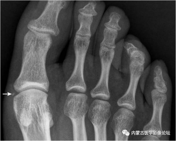 30.跖骨外生骨疣:第2跖骨近端内侧见三角形骨突(箭),边缘光整,呈宽基与宿主骨相连,此点可与跖骨间骨相鉴别。