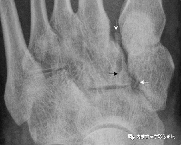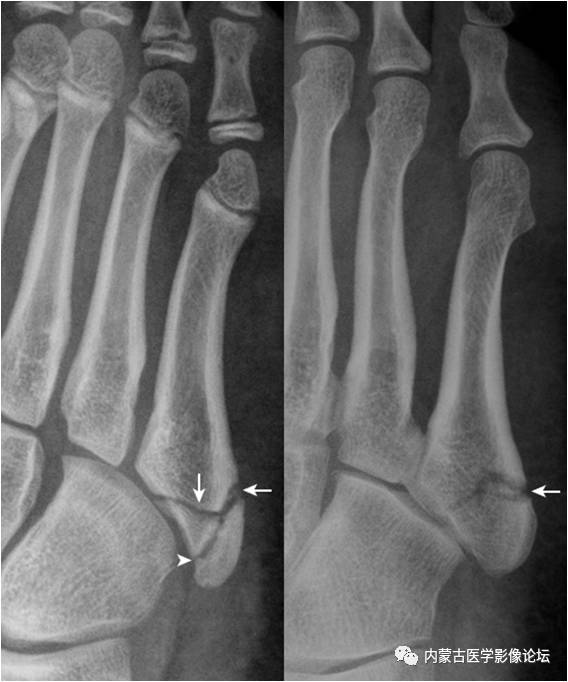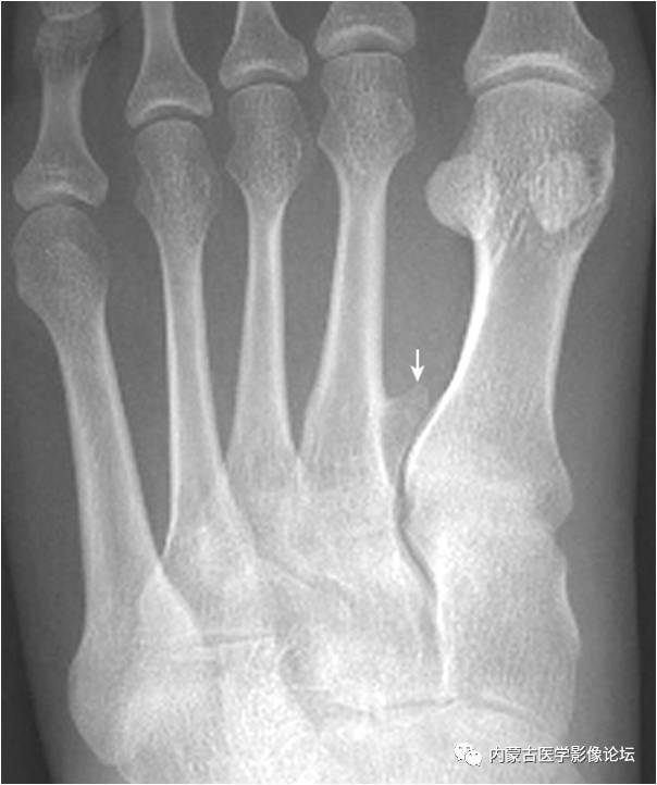 17.跖骨间骨:跖骨间可见边缘光整的小骨性结节(箭),为正常变异。跖骨间骨需与撕脱骨折鉴别,撕脱骨折时对应跖骨存在明确撕脱缺损区。